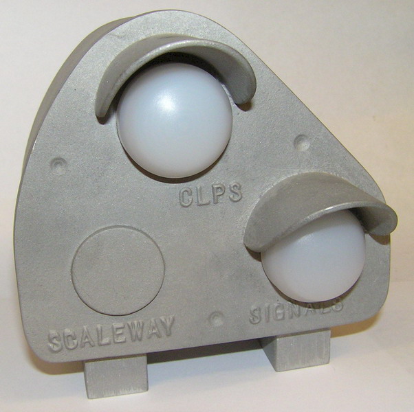 A shunt signal for movements not controlled by normal running signals. A proceed aspect is two white lights illuminated at 45 degrees. A stop aspect is 1 red and 1 white light illuminated horizontally. Unit consists of a cast aluminium body with mounting feet and a faceplate casting. The faceplate casting with integral hoods tilts back at 5 degrees from the vertical due to the tapered feet of the body casting. The lamp units take a MBC bulb or LED unit the lens is sealed to the faceplate by a rubber gasket like wise the faceplate is sealed to the body casting by a rubber gasket. Cable entry is at the rear of the box via a conduit or gland fitting. Un-machined casting set: £64.00 inc VAT Un-machined castings and component set: £93.50 inc VAT Machined castings and components set: £105.50 inc VAT Fully finished, wired, tested and painted: £126.00 inc VAT |