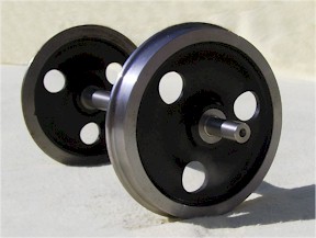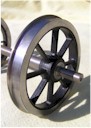3'1" 8 Split-Spoke Wagon Wheel Set. Suitable for 5" gauge. GL5 Standard flange profile. Both tyre and axles made of CNC turned steel, with a centre of engineering grade nylon reinforced with glass. Non-Passenger carrying. Diameter of tread (approx) - 3.259" Product No. WSSS05 £57.75 inc VAT for a pair. (Four wheels on two axles.)