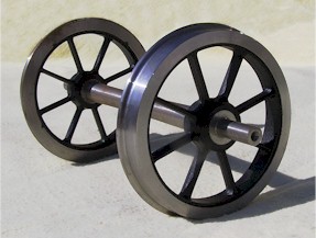 3'1" 8 Spoke Wagon Wheel Set. Suitable for 5" gauge. GL5 Standard flange profile. Both tyre and axles made of CNC turned steel, with a centre of engineering grade nylon reinforced with glass. Non-Passenger carrying. Diameter of tread (approx) - 3.259" Product No. WS8S05 £57.75 inc VAT for a pair. (Four wheels on two axles.)